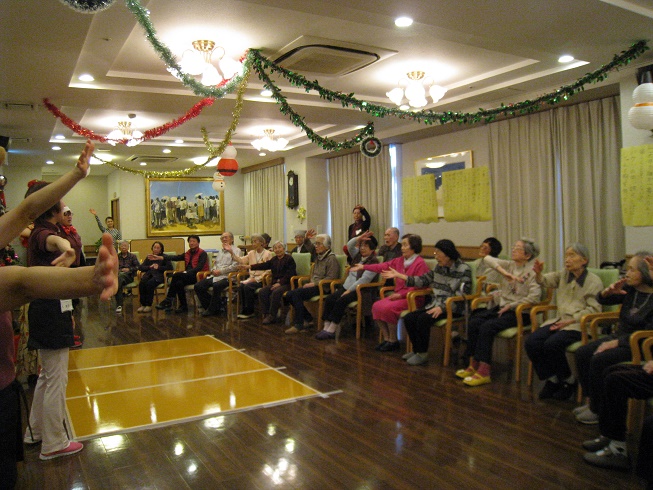 次のプログラムはフラメンコです。プロのダンサーをお招きし、スタッフも少し踊りを披露しました。足を踏み鳴らすのを見て、入居者様の足も自然にバタバタと動き出し、会場は「オレ~!」と掛け声も出て盛り上がりました。